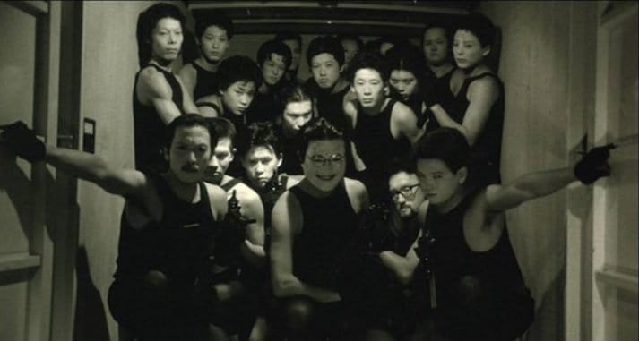 Three years later he does, and the film, in the beginning a recognizable full-color Japanese crime saga, complete with bullets and katanas, has turned black and white and entered Alphaville territory. The returning soldier, Koichi (Chiba Shigeru), wears dark sunglasses and a trench coat. On arriving in the city he feels like he’s being followed, and Oshii tracks him along the abstract architecture of a modern transit station at night, all sharp angles and shadows, footsteps resonating on the pavement. As he makes his escape, the film nods in the direction of silent comedy, and the film will oscillate between these two modes, modernist alienation and wacky hijinks, for the rest of its runtime.