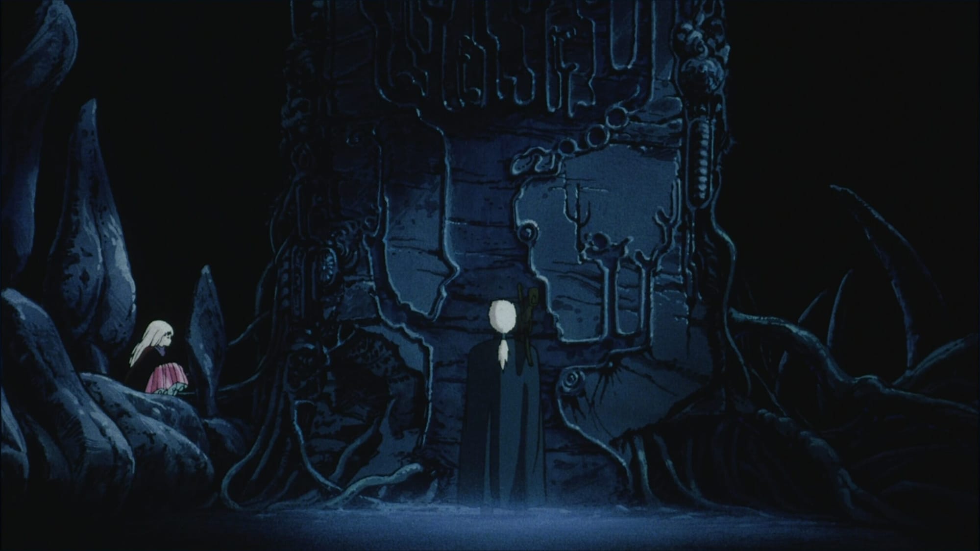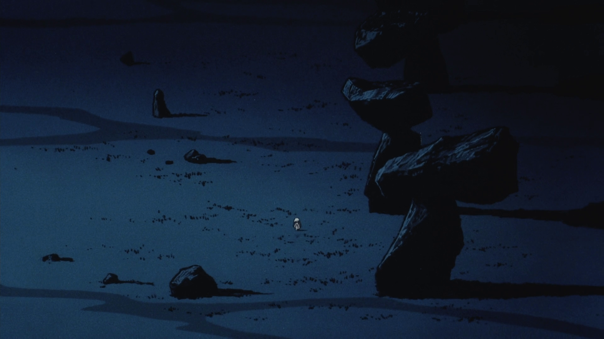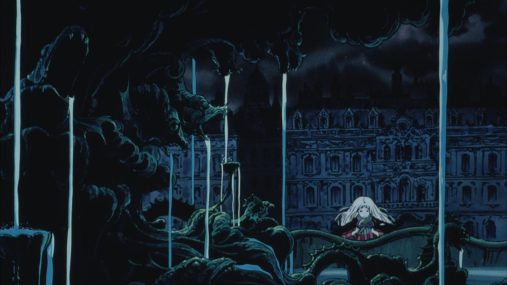 Angel’s Egg was released straight to video (an OVA in anime parlance, the egg pun being wholly coincidental) and eventually became a cult classic both in Japan and abroad as its obscurity and openness to interpretation are highly prized among the obsessive and arty and its deliberate pace and lack of easy answers were (and remain) abhorrent to the mainstream. Like René Laloux’s Fantastic Planet, it’s an ideal midnight movie, its open spaces in plot and image ideal for floating within in the altered states of a late night audience. Seeing it today, it is most striking for its constructedness, the kind of slight scruffyness that comes from hand-drawn, multiplane animation that has been almost wholly lost in the decades since animation went digital. The film is remarkably static, with an unchanging background the image is given motion either by the movement of one of the two figures, often dwarfed by their surroundings, or simply by the movement of the camera alone. It truly is a world at its end, and by the dozens and hundreds of bottles we see along the girl’s path, it has been there for a very long time indeed.