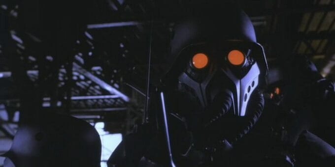 The opening image is familiar if you know the later anime written by Oshii and directed by Okiura Hiroyuki, Jin-Roh: The Wolf Brigade (or, if you’re like me, Kim Jeewoon’s 2018 live-action Korean remake Illang: The Wolf Brigade): a terrifying soldier in black armor holding a large gun, the only color on their body being a pair of frighteningly glowing red eyes. The soldier belongs to an elite unit of the police that has just been disbanded by government order for their use of excessive force. Three members of the unit have refused to surrender and are on the run. Resting in a warehouse, they are set upon and two of them are wounded. They offer to stay behind while the third escapes to a waiting helicopter. He vows to return eventually.