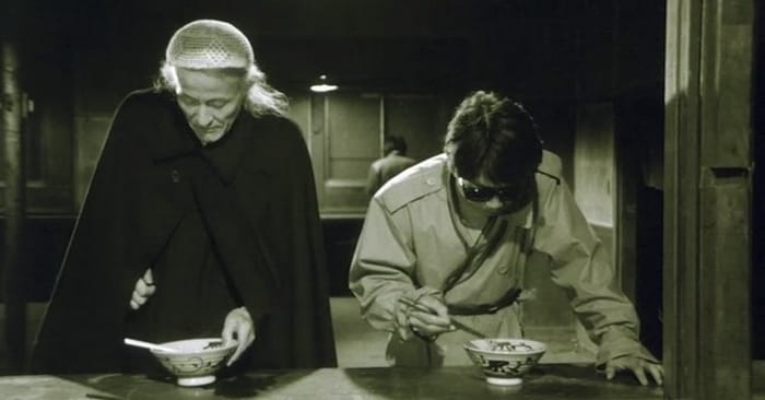 This is the mode of early Godard, and while Alphaville is the strongest influence, especially visually, the way the film careens between absurdity and profundity recalls as well A Woman is a Woman, Le petit soldat, and Masculin-féminin among other classics. Koichi is in search of his former comrades, but nothing in the city makes sense to him anymore. His unit (the wolf brigade) are styled as dogs, while the enemy hunting him are cats: the hordes of bad guys he beats up make meowing sounds, and the city seems to be dominated by a corporation whose symbol is a cat’s face (their instant noodles taste terrible). One of his friends is now a pool hustler, whose introduction leads to a vaudeville-style musical number. One other, not one of the two he left behind but another former colleague, patronizes a noodle stand, one which is literally underground as the government has inexplicably banned noodle stands for being a baleful influence on society. Another plays the role of an orientalist kept woman (the hotel Koichi stays at is called The Orientalist) for a guy dressed like a North Korean dictator who seems to be in charge of the forces hunting Koichi. Her story alternates between tragic and heroic modes. Haunting him throughout his journey is a beautiful photograph of a woman, reproduced in hundreds of posters all over the city and playing on a loop in the movie theatre he finds himself waking up in more than once. In the end, she’ll become a living character herself, albeit one who only watches the action and somehow turns into Red Riding Hood(?).