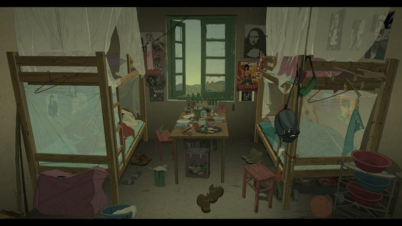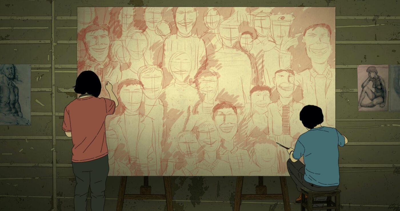 The film focuses on a small group of guys, aspiring visual artists (one specializes in oils, another studies traditional Chinese painting, one is into conceptual and performance art, etc) who hang around drinking beer, theorizing about life and art and women (not necessarily in that order), and occasionally attend class or work on their projects. The animation style is essentially the same as Have a Nice Day: grimy and seedy, every surface textured to the point that it looks diseased: worn-down or pockmarked, stained by stray paint or merely crumbling after decades of neglect. It’s unpleasant to look at, but it is roughly analogous to the environments of Jia Zhangke’s early films like Xiao Shan Going Home or Xiao Wu, wherein he captured the last days of his crumbling hometown as it was in the process of redeveloping into something shinier.