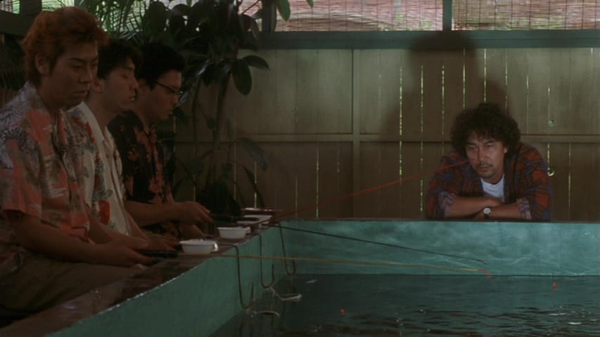 We eventually learn that Yakusho is a friend of Nishijima’s father and that, in the wake of his accident, the family split apart: his father traveling the world doing charity work, his mother working at a shop in the city, his sister, rumored to have gone to America, shacking up with Aikawa Show (again bespectacled, but otherwise a much nicer guy here than in Serpent’s Path). Yakusho is living on the family’s sizable exurban property, running a fish farm where city folks can sit around a tank in a warehouse and try to catch carp, pretending they’re in the wilderness, and generally using it as an illegal dumping site for various bits of industrial junk and detritus.